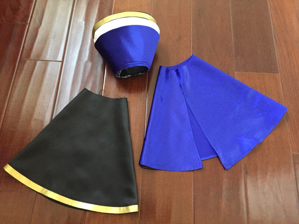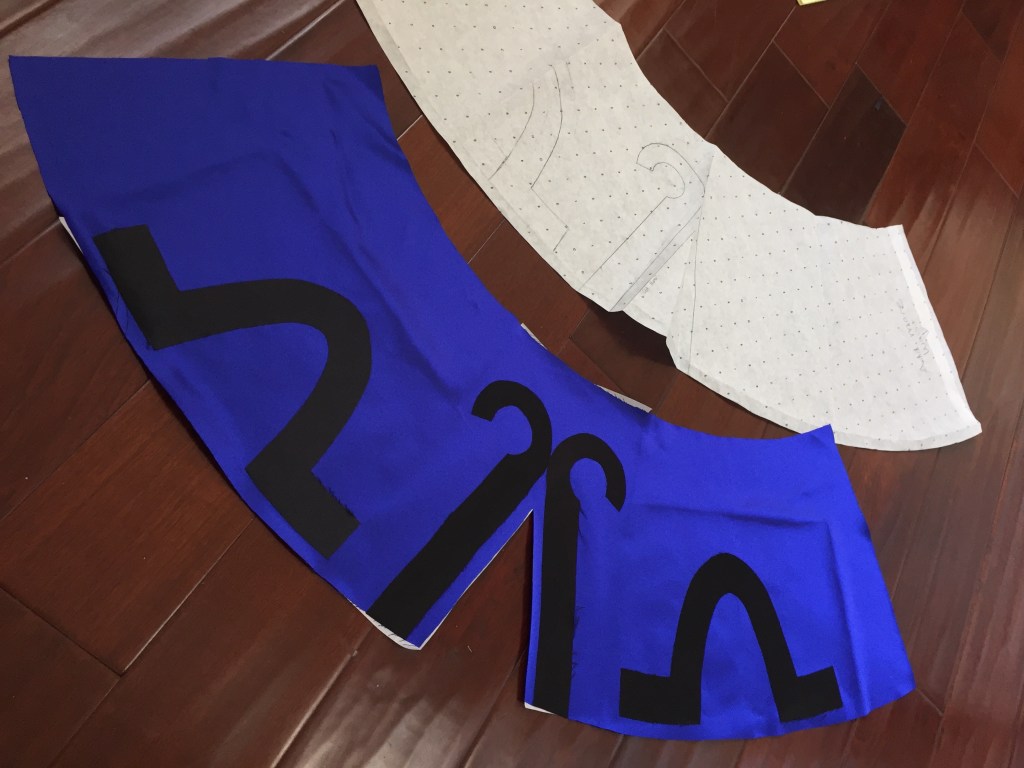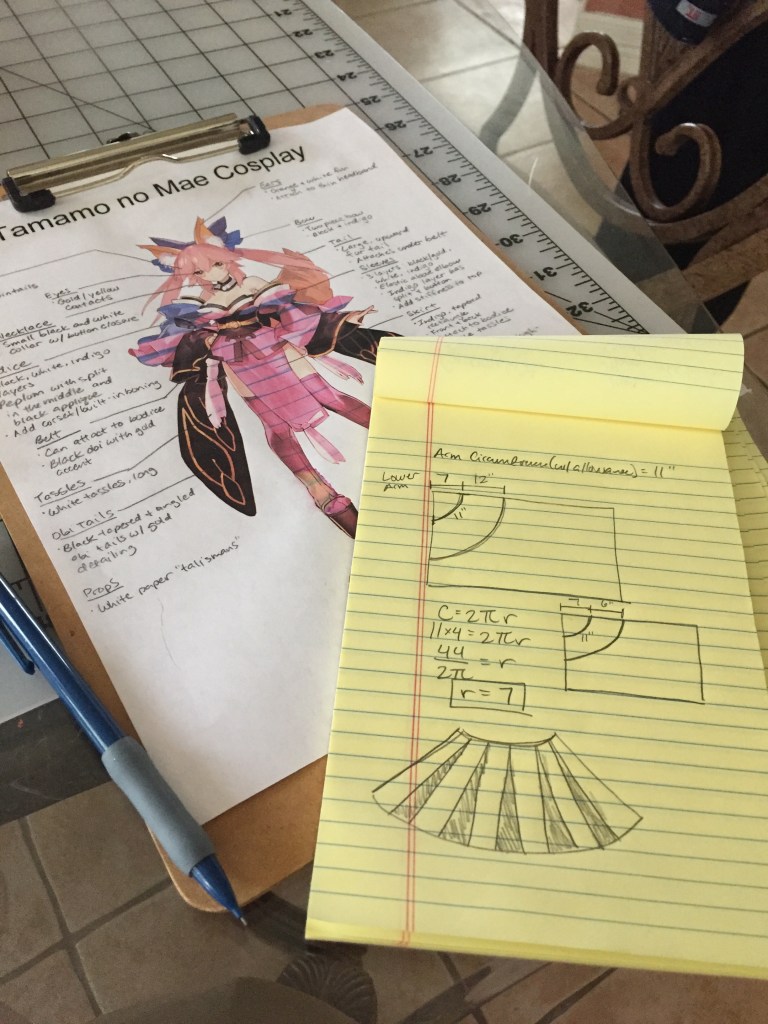 Tamamo’s outfit was designed as a strapless dress with a short circle skirt and hanging panels underneath the skirt in the front and back. All patterns and appliques were self-drafted.