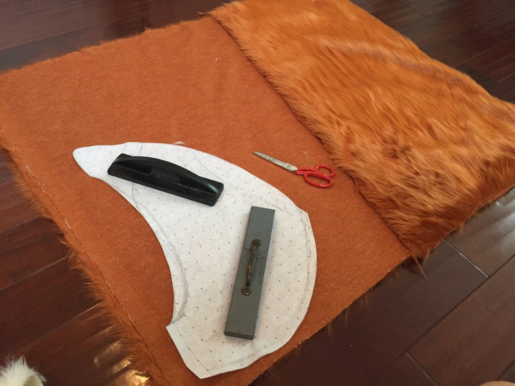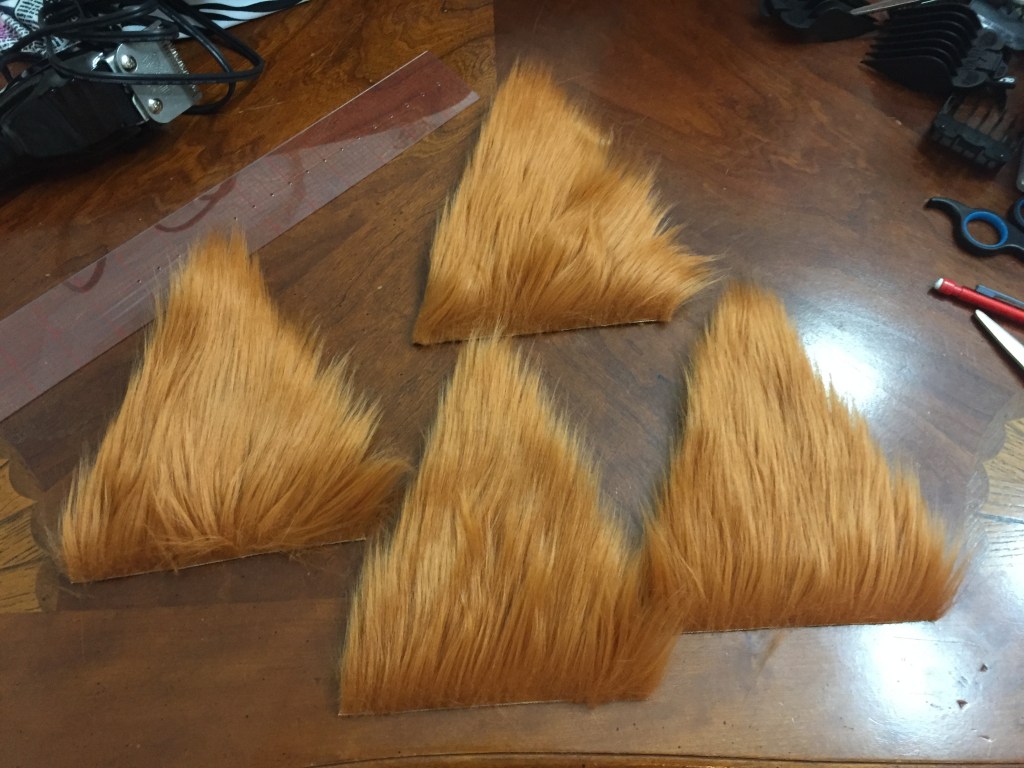 For the ears, fur triangles were cut out and shaved using an electric razor to shorten the fur. The fur triangles were sewn together and balls of white fur were sewn on the inside of each ear. Both ears were hot glued to a headband base.