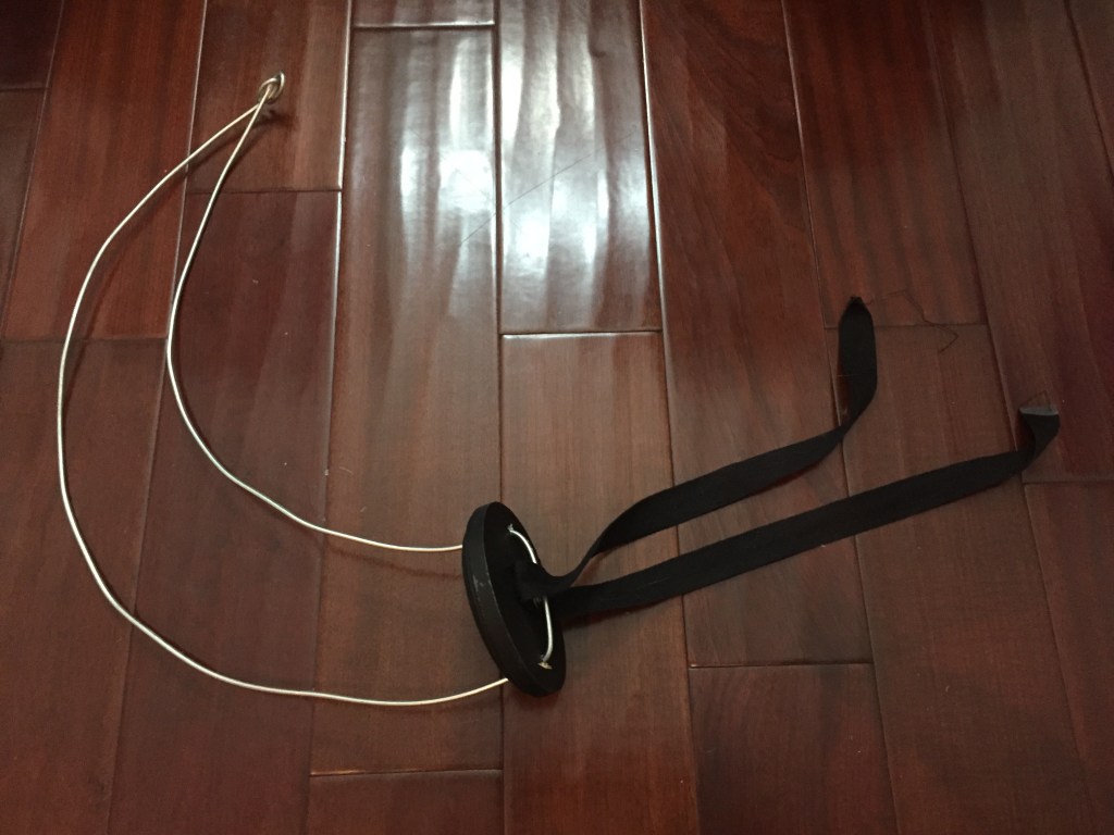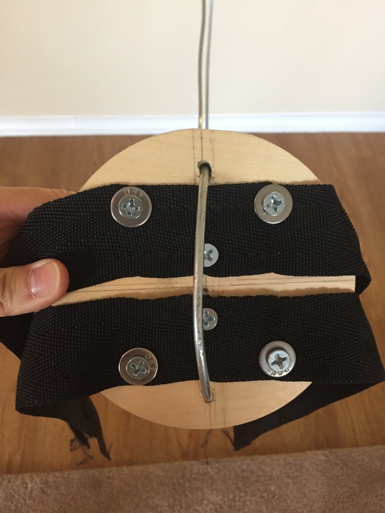 A harness for the upright tail was created using a wooden circle as the base and 9-gauge wire as the tail frame. Two straps were attached using screws. The fur tail cover was put on the wire frame and stuffed with Poly-Fil.