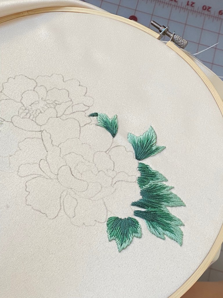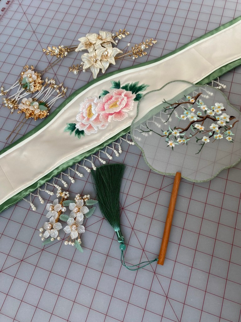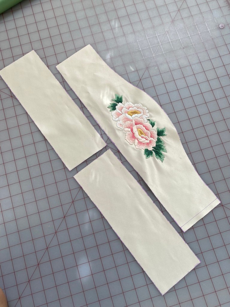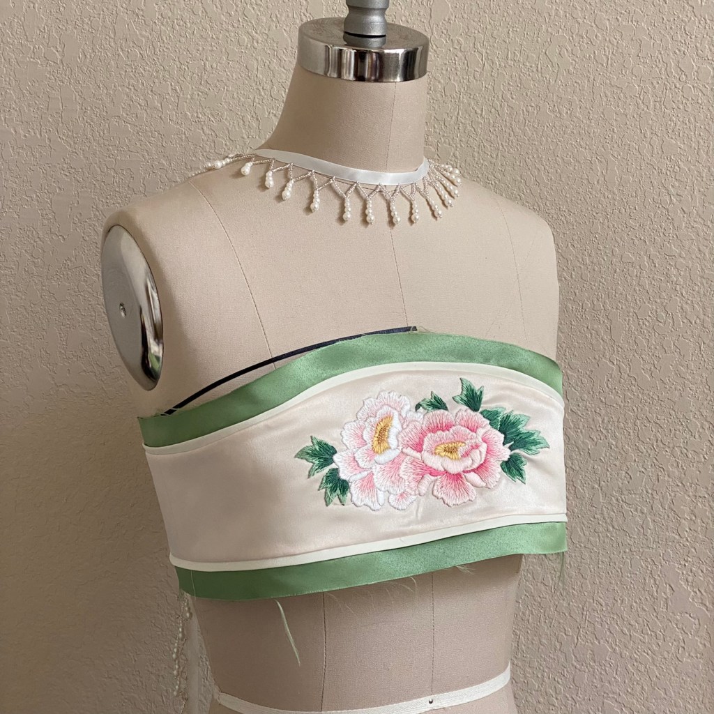 The chest “belt”, or hezi, is made of satin with hand-embroidered flowers in the center. Cream and green satin edges along with beaded trim were added. Eight ties were sewn in the back to close the hezi.
