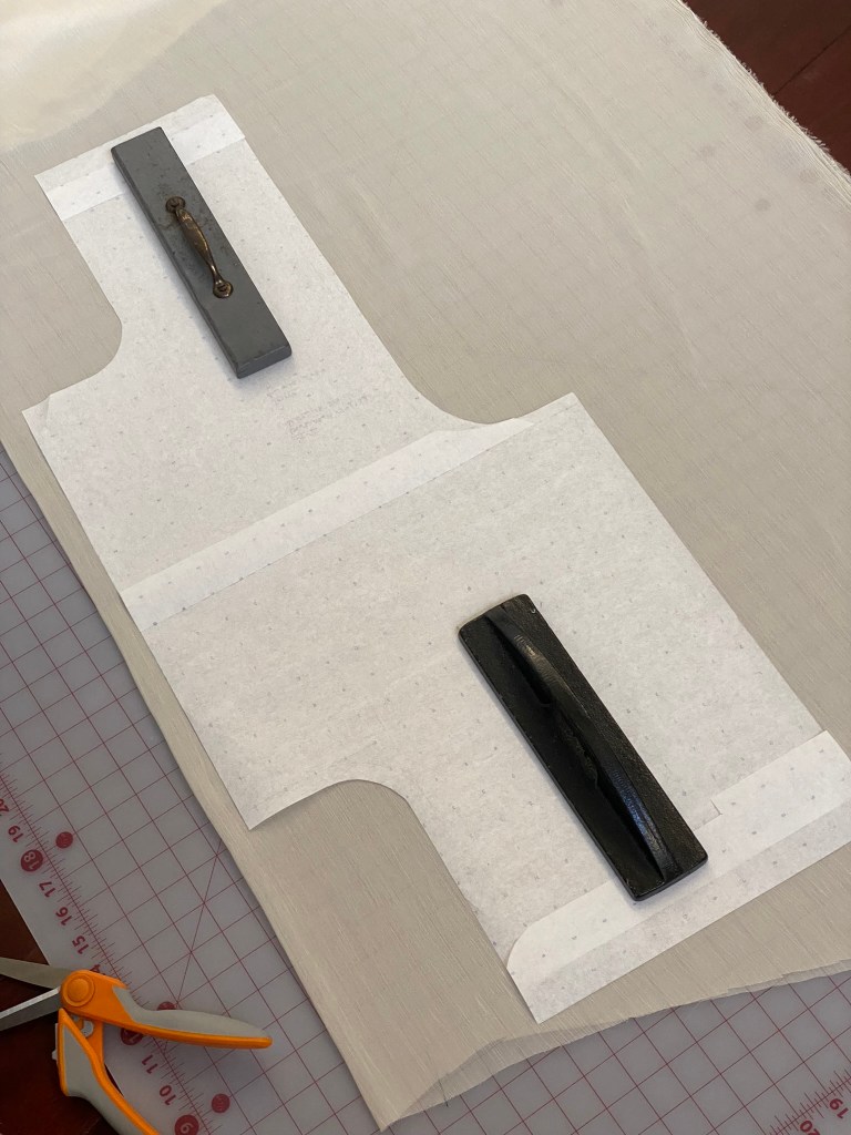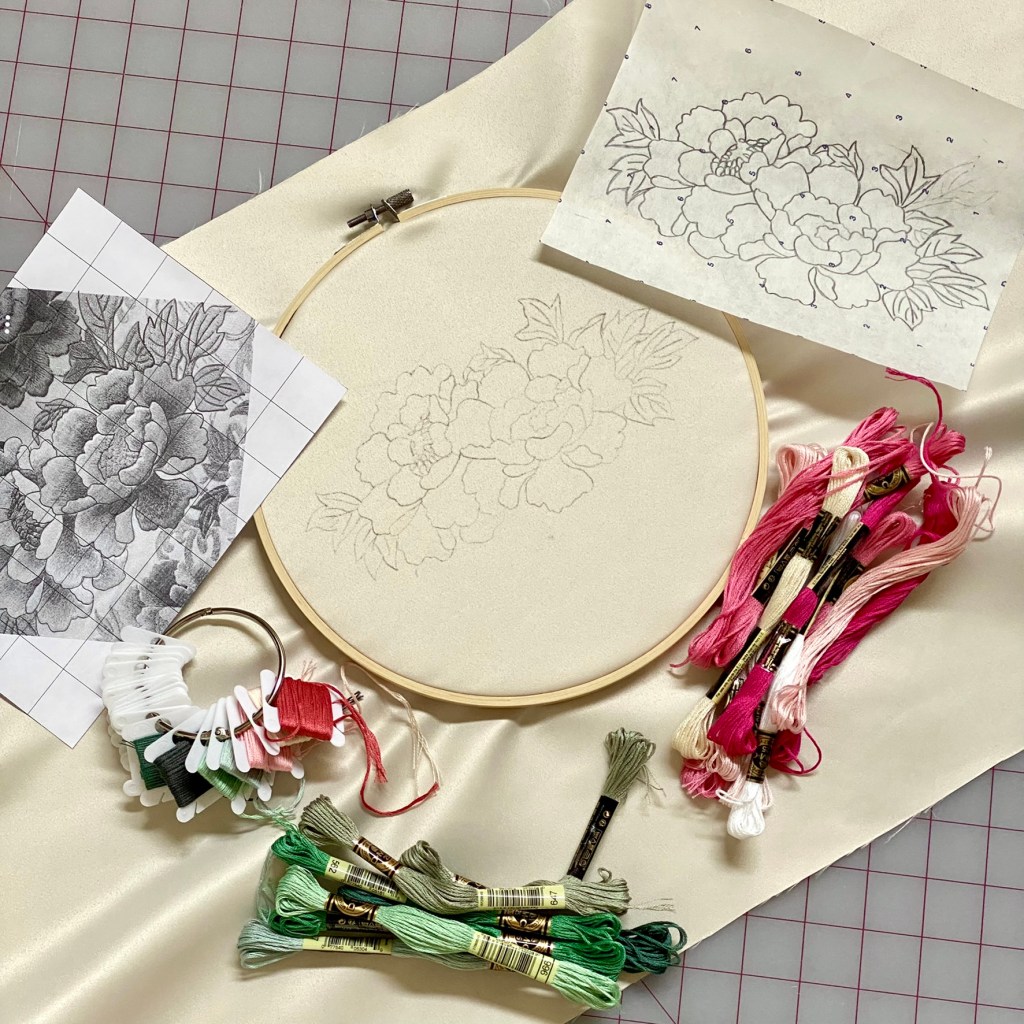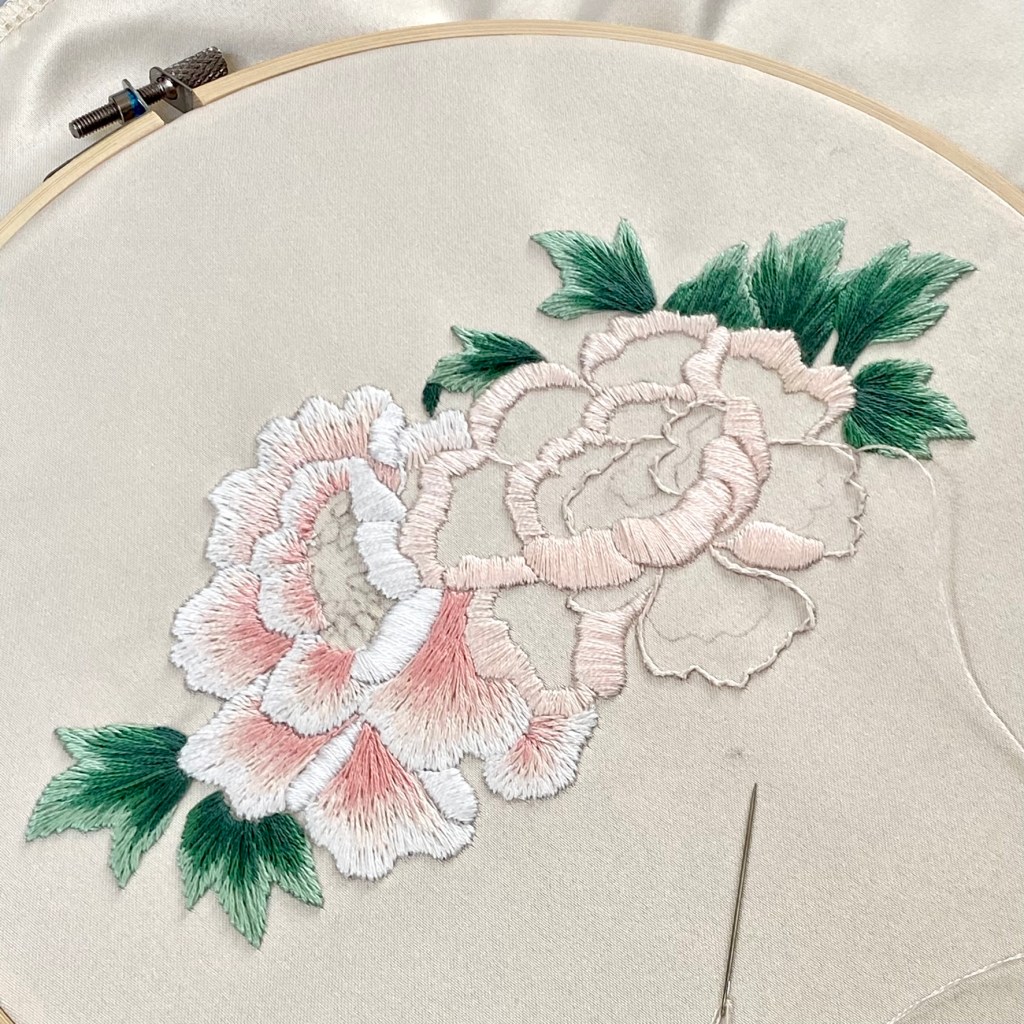 The chest “belt”, or hezi, is made of satin with hand-embroidered flowers in the center. Cream and green satin edges along with beaded trim were added. Eight ties were sewn in the back to close the hezi.