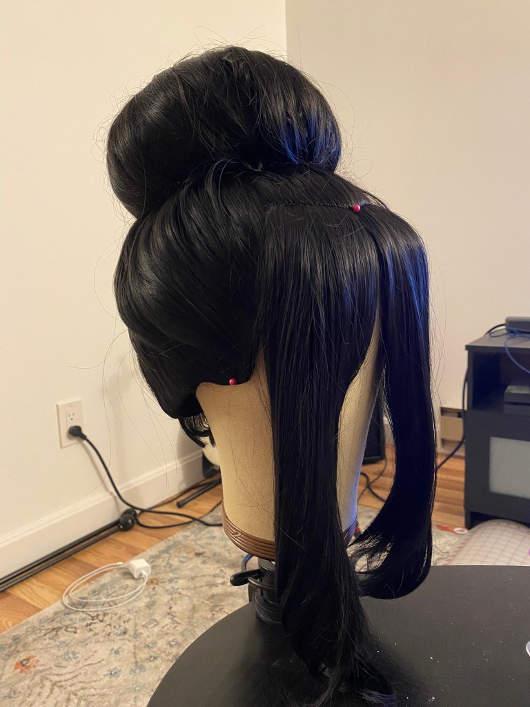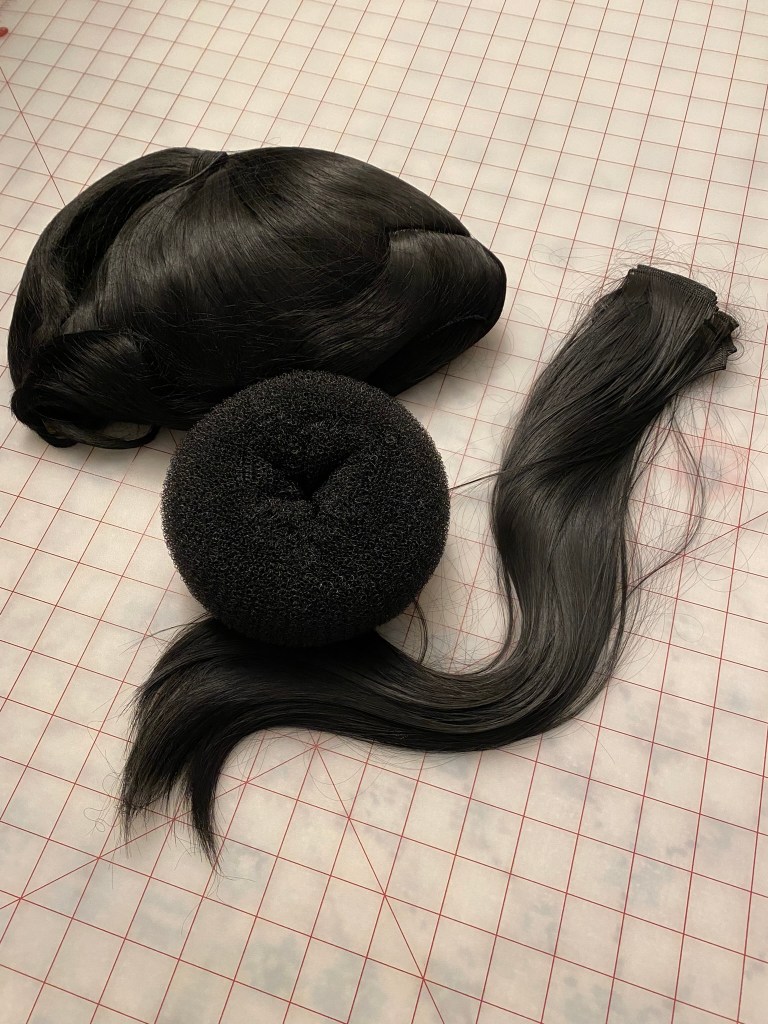 The wig was styled using a Black (CL-078) Jeanie base wig from Arda Wigs with matching short wefts that were crimped and sewn to a jumbo hair donut to create the bun.