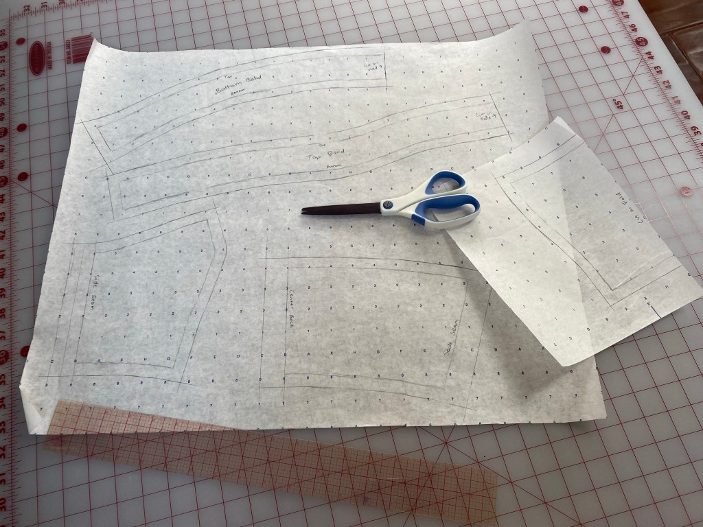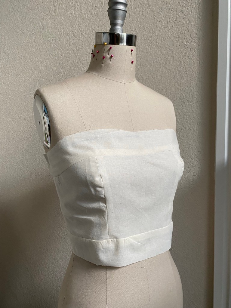 The bodice was drafted as a strapless bodice with white piping and lace trim used for accents. Straps were created from long strips of fabric with piping at the edges.