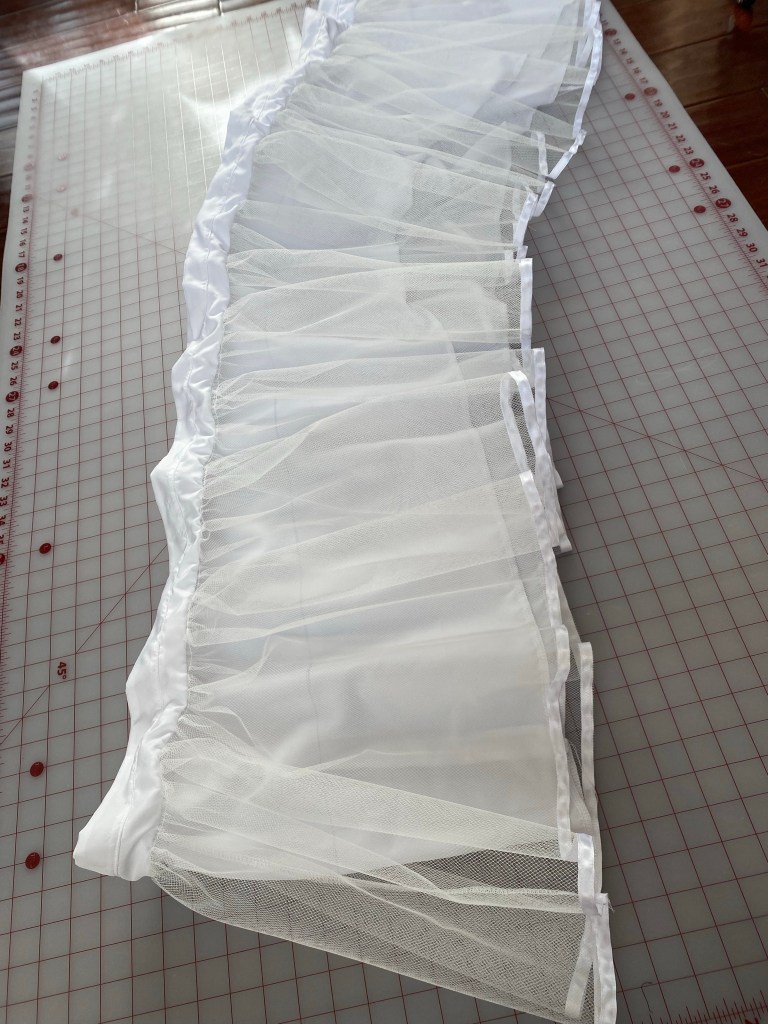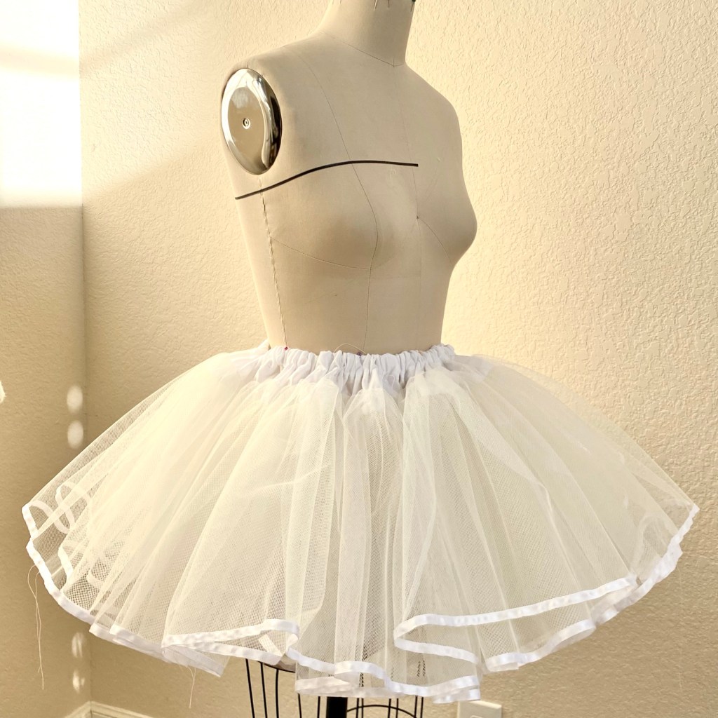 The petticoat consists of two layers of gathered tulle sewn on lining fabric with an elastic waist.