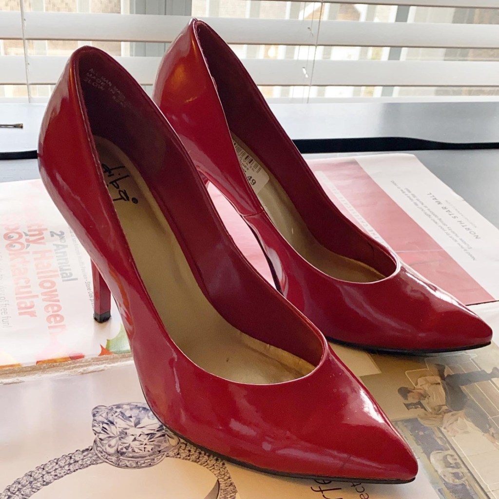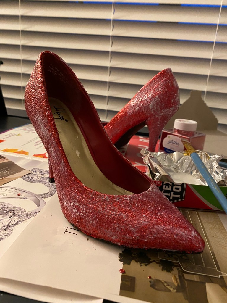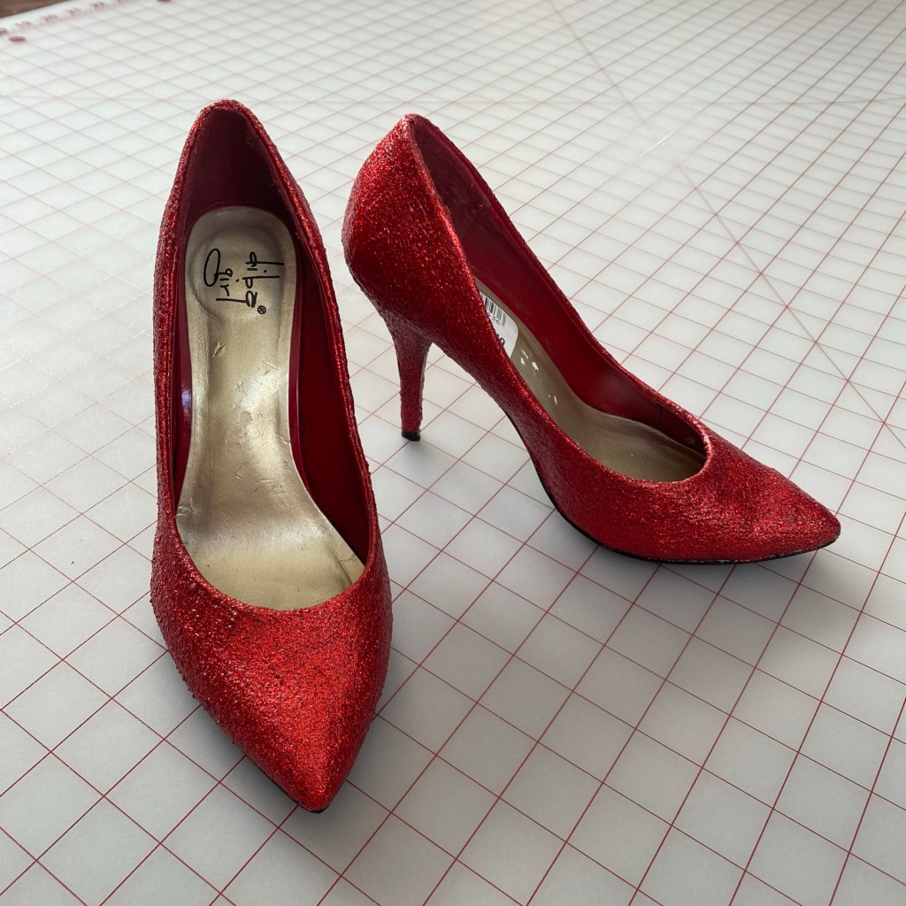 Thrifted red pumps were used as the shoe base. The shoes were painted with two layers of a glitter and Mod Podge mixture.